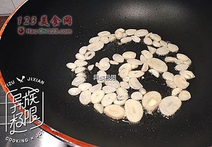 4、起锅,注入少量食用油,放入蒜片,小火煸至出香味。