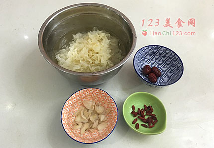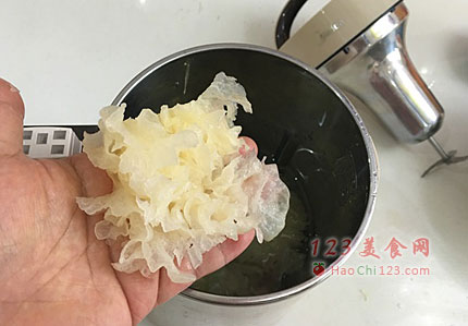 2、豆浆机内放入1100克清水。银耳提前浸泡2小时,洗净,去掉根部,放入豆浆机内。