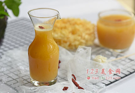 7、工作完成后,会有一层浮沫,用勺子将其撇去,加入适量冰糖调味即可(因为加了大枣,所以不放糖也有甜味,要是不想长胖就直接饮用吧)。