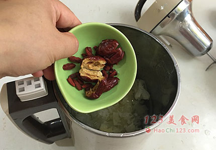3、大枣去核,与枸杞一起放入豆浆机内。