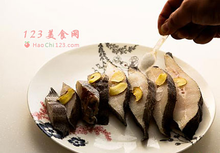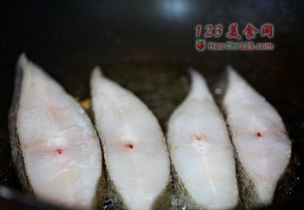 3、腌好的鱼用水冲一下,用厨房纸擦干。锅洗得很干净后,烧干水,用新鲜姜块擦一层姜,放油,把一面完全煎好,煎得发黄之后,再翻过来煎另一面,千万别来回翻面。如果一面煎好了,还不能轻松翻动怎么办?别急,先关了火,凉一会就能翻了,然后,再煎另一面。