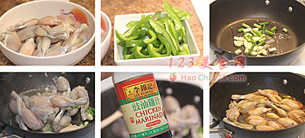4、5、加入田鸡腿炒至变色,加入豉油鸡汁,翻炒后加水没过田鸡腿,大火煮开,转中小火烧15min,然后开盖收汁。