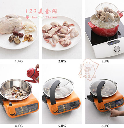 3、把焯好的乳鸽放到自动锅里,加入水,姜片,香菇,红枣和玉兰片,盖上锅盖,按下“清炖鸡”键即可。