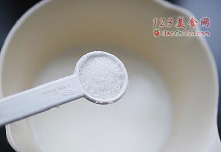 2、倒入细砂糖,然后放到火上加热,同时搅拌至糖融化。