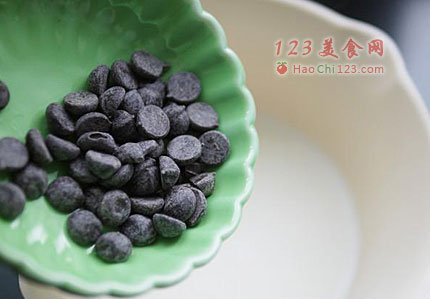 3、待牛奶微微沸腾后离火,加入黑巧克力,不停搅拌。