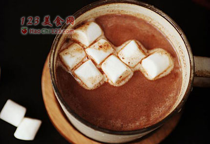 4、直至牛奶和融化巧克力搅匀后盛入杯中,放上棉花糖即可。
