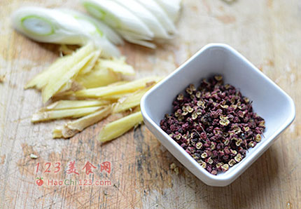 4、这个时候准备配料,葱姜切段,花椒一把。