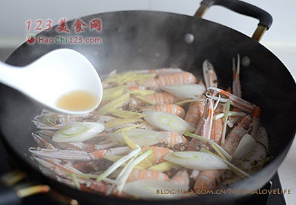 5、再把这些配料均匀的放在虾上,淋上一大勺料酒,再加盖小火焖3-5左右分钟即可。