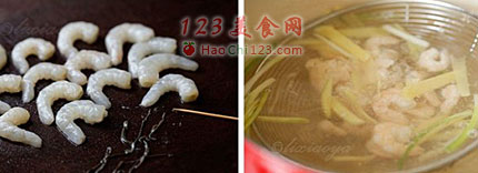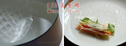5、烧开一锅水,冷却至50度左右,取一张米皮在温水中快速涮烫一下随即取出,放入抹了薄油(防粘)的平底大盘内,依次放上罗勒叶、2只虾仁、青瓜丝、胡萝卜丝、火腿丝、绿豆芽等配菜(罗勒叶正面朝下,虾仁和罗勒在前,其它蔬菜丝在后面,这样卷出来会好看些)。