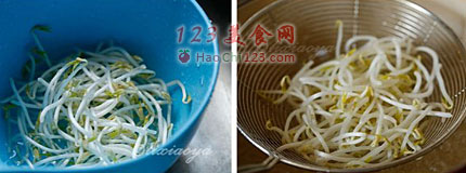 2、绿豆牙掐去根,淘洗干净,入开水锅轻焯后随即捞出,沥水备用。