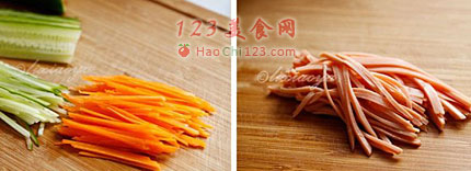 3、青瓜、胡萝卜、火腿片等配菜依次细切成丝备用,萝勒叶洗净备用。