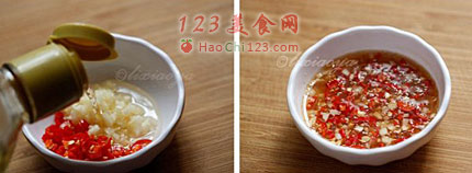 3、沾酱可以用市售甜辣酱,不过最好是自己调制,清爽健康又美味,鱼露、米醋、盐、糖做底味,蒜和辣椒视个人喜好添加即可。[LaoYanHuo.com]