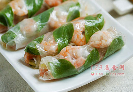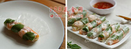 2、配菜可以根据自家喜好来调整,或当季的时令蔬菜都是个好选择,虾仁和罗勒最好不要省去,罗勒换成食用薄荷也可以,一条米卷配两个小虾仁,如果虾仁比较大个可以一剖为二使用。