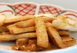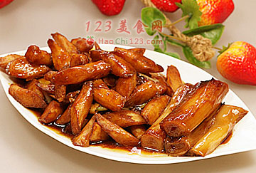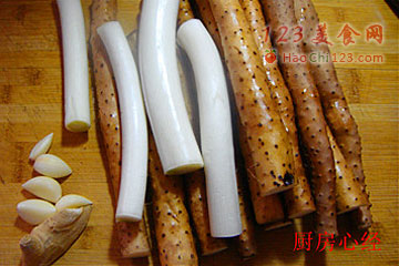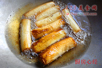 5、起锅放炸好的葱油,爆香姜蒜,放入山药,调入酱油、蚝油、料酒,清水,盐,糖,小火收干汤汁即可装盘,然后码上蒸好的大葱。