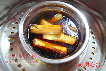 3、葱油盛出备用;炸好的大葱放入容器中,加入老抽;蚝油;料酒,清水蒸10分钟。