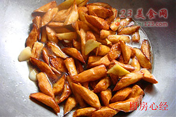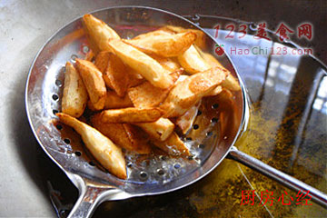 4、山药去皮,切成滚刀块,入油锅炸成金黄色捞出。