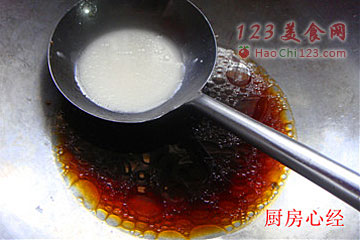 6、将蒸制大葱剩余的汤汁倒入锅中,勾芡浇在山药上面即可。