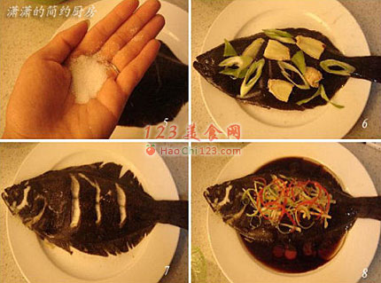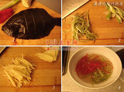 7、端出鱼盘,拣去葱姜片,滗去蒸出来的水,另撒上提前浸泡的葱姜丝,红椒丝。