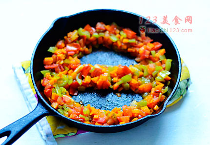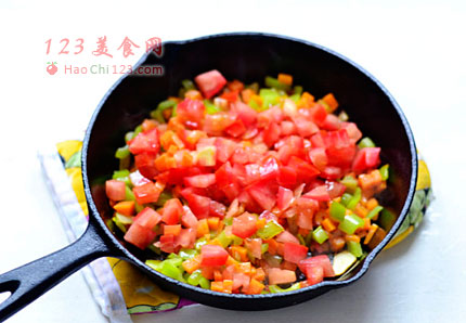 4、翻炒到胡萝卜丁和青椒丁稍微变软时,将小茴香籽和西红柿丁加入锅中,继续翻炒。