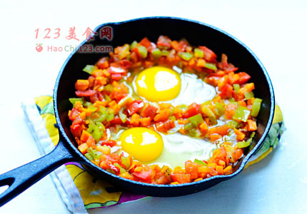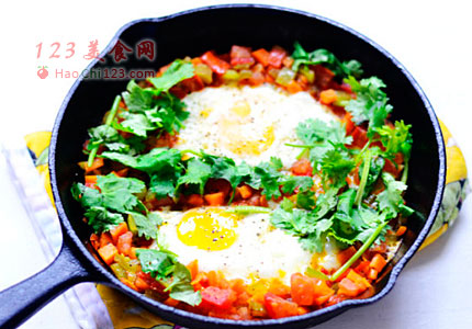 7、大约将鸡蛋煎制56分钟左右,关火,撒上香葱碎或香菜,再根据口味调入现磨黑胡椒即可食用。