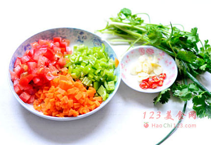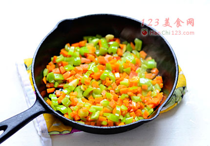 3、将切丁的青椒,胡萝卜一起加入到锅中翻炒。