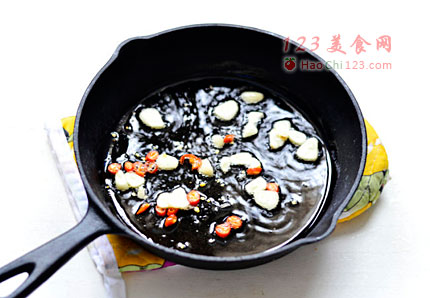 2、平底锅加热,倒入适量橄榄油,将蒜片和小红辣椒入锅中翻炒出香味。