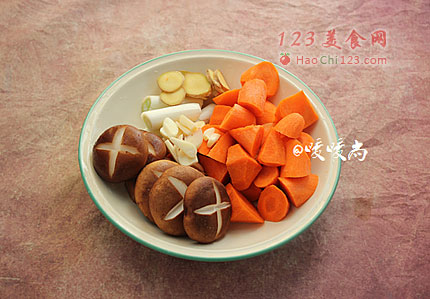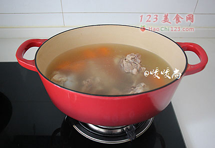 3、另起汤锅,下焯水后的猪棒骨,放入姜片葱段和胡萝卜,盖上锅盖大火烧开后转小火煲40分钟,最后调入半克的盐调味后关火备用。