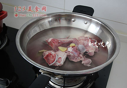 2、炒锅内放适量的冷水,下斩件后的猪棒骨、姜片、料酒,大火烧开后转中火煮5分钟左右,然后将猪棒骨捞出用温水冲洗掉残渣和浮沫。