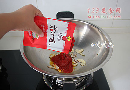 4、另起炒锅,锅子烧热后放少量的花生油,下蒜片炒出香味,然后下红果家茄汁面汤料简单翻炒一下。