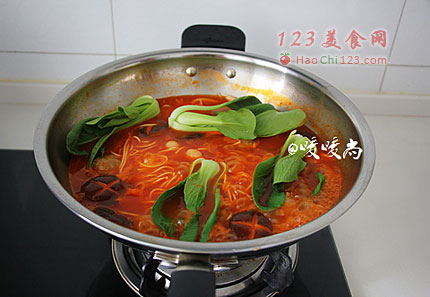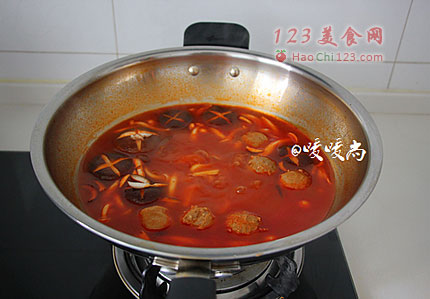 5、调入1200ml煲好的猪骨汤(红果家茄汁面汤料和水/骨汤的比例官方推荐为1:6),将汤汁重新烧开。下清洗干净的白玉菇、香菇和牛肉丸,煮至菌菇和牛肉丸全部熟透。