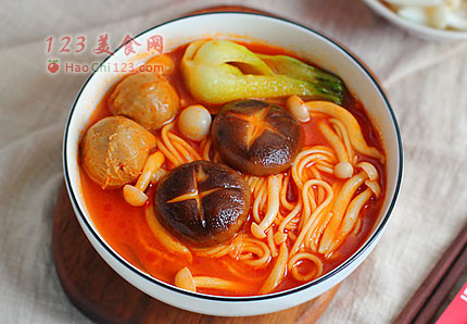 7、将煮好的面条捞出,浇上一些番茄汁,最后码放上香菇、牛肉丸和蔬菜即可食用。