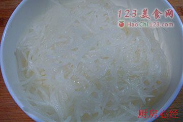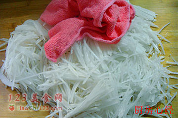 3、接下来,先处理大白萝卜。将萝卜切丝,然后用干布擦干萝卜丝的水分。