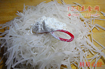 4、撒上几勺干淀粉,在抓匀。这样处理的萝卜丝,才能够晶莹剔透。