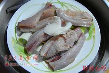 9、将焯过水的鱼肉的底部,垫上葱姜,放上一块猪油,料酒,上蒸锅,蒸制10分钟,这样的鱼肉才紧实。