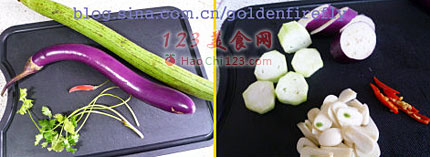 2、茄子洗淨後,切成雨絲瓜厚度相同的圓片,清水浸泡10分鐘備用。