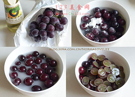 2、3、最简单最干净的洗葡萄方法:一勺淀粉一勺盐,加水揉搓一下,葡萄就立刻变得一颗颗亮晶晶的了。