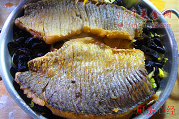 7、然后,擦干水分,挂一层极薄的面粉,入油锅炸成金黄色捞出。这一步就完全可以代替烤箱了。将炸好的鱼片,码在铁锅的配菜上面。