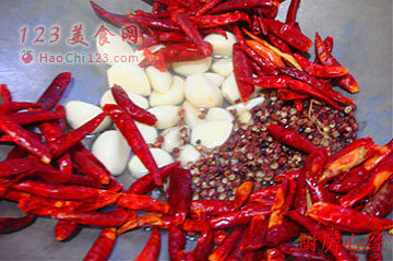 8、另起锅,加入大蒜、花椒、干辣椒、少许清水,煮干水分。这样处理能够煮出食材的香味。