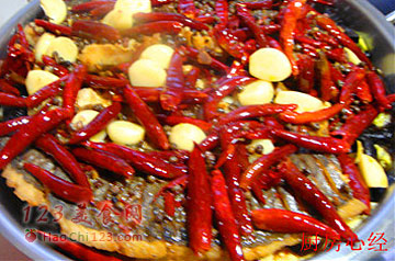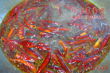 9、锅中的水分煮干后,加入1-2手勺的生油、郫县辣酱,煸炒出辣味来。然后加入开水,调入酱油、料酒、适量的盐。