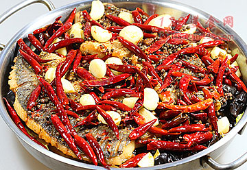 10、最后,将锅中的红汤倒入铁锅的鱼片上面。然后放在电磁炉上加热煮开,直接在桌子上食用。