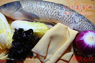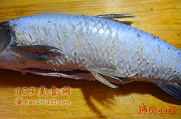 4、草鱼洗净以后,再用90度开水浇烫鱼皮,用刀刮净鱼皮表面的粘液。这是烤鱼干净漂亮的重要一环。