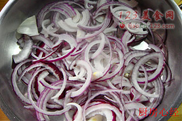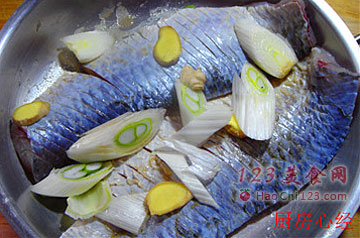 2、用一只厚底的平底锅,垫上葱头丝,既能防止糊锅,还能烤出香味来。比烤箱还好用,而且烤鱼直接上桌,特方便。