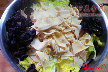 3、然后将娃娃菜手撕成大块,干豆腐片切成片,木耳等均焯水以后,铺在葱头丝上。