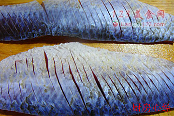 5、只保留鱼肉做烤鱼,不用吐刺很方便。鱼头、鱼骨可以煮鱼汤喝。将剔下的鱼肉,打上很密实的一字直刀,要从鱼皮的一面打花刀,吃起来方便,刀口不要太深,切断鱼皮即可。
