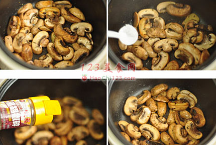4、略微翻炒至口蘑稍稍变软变薄。