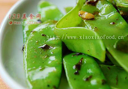 2、锅中放油,烧热,下蒜末爆出香味,将荷兰豆倒入锅中,翻炒数下,让荷兰豆逐渐变软。