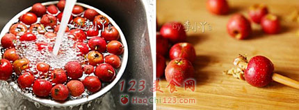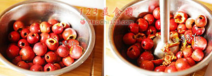 2、用筷子取山楂核,用筷尾(即粗的那端)从山楂蒂处插入,如果山楂比较大,用筷子左右扭转直至取出所有的核,操作起来很方便,如果手边不能取核器这也不失是一个好办法。[LaoYanHuo.com]
