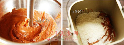 3、打好的果泥放入面包桶中,加入白砂糖。