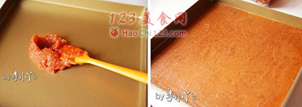 5、挖2-3大勺果馅放入不沾烤盘内,用塑料刮板刮平,在通风处晾置一晚。