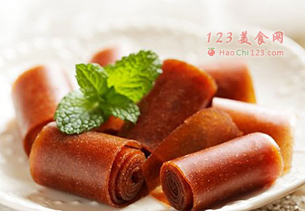 6、如果不想自然晾干用烤箱低温60度烤3小时也可以,晾好或烤好的山楂皮从一端揭开卷起,切成小段即可。